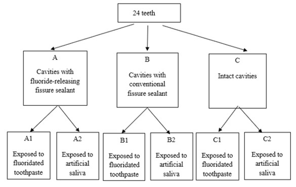 The samples were randomly divided into three equal groups of A, B and C each (n=8). Using a fissurotomy bur (Teeskavan, Iran) and a high-speed handpiece (NSK, Japan), cavities with dimensions of 4*2*1.5 mm were prepared in the middle third of the buccal surface of each sample, so that the occlusogingival, mesiodistal and buccopalatal dimensions of the cavity were 2, 4 and 1.5 mm, respectively. In the cavities of the first group (group A), a fluoride-releasing fissure sealant (Embrac Wetbond Sealant, Pulpdent, USA) and in the second group (group B), a conventional fissure sealant (Master-Dent, Light-cured, Opaque, USA) were placed, and the third group (group C) did not undergo any intervention.
