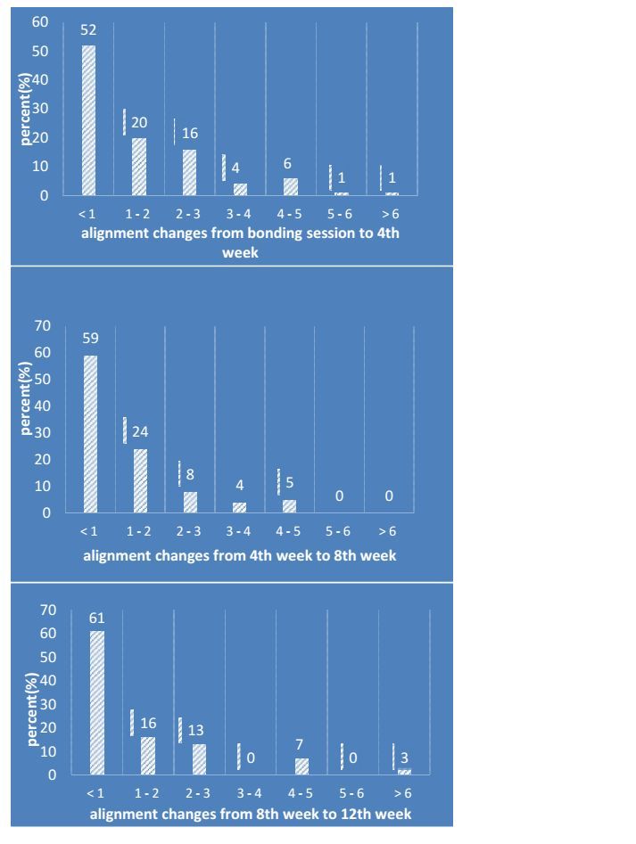 No patients reported regression of alignment changes during the three-month course of study, and the minimum reported change was zero. However, they reported smaller changes at the second and third time intervals in comparison to the first time interval, which was not statistically significant. It might be due to the fact that they became more concerned about their alignment at the second and third intervals.