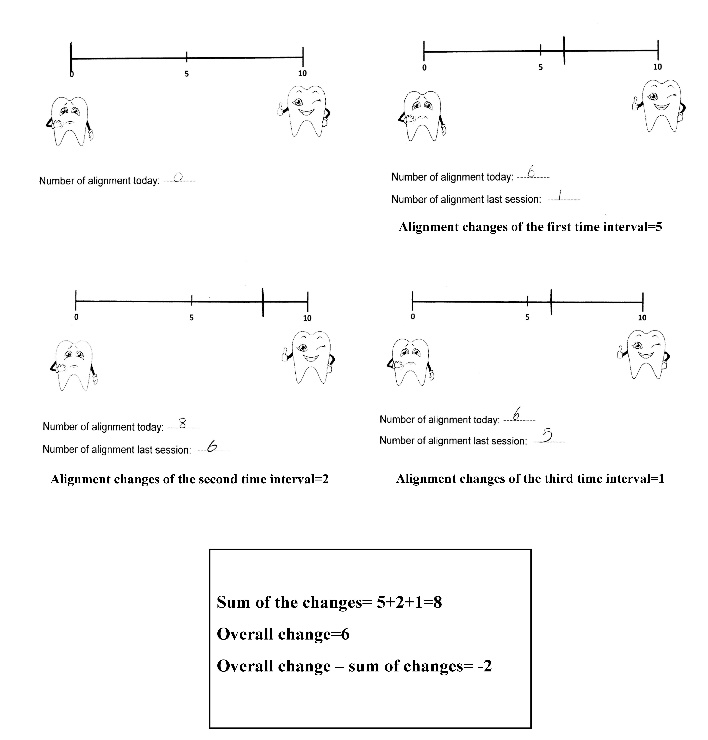 Considering that patients rated the alignment of each session twice (during that visit and during the next visit), for higher representation and greater reliability of how the patients perceived their dental alignment, the numbers given by the patient in the same session were considered to calculate the alignment change between the two sessions.