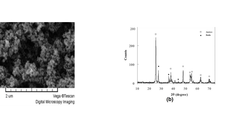 Figure 1.(a) SEM image; (b) XRD diagram of TiO2 nanoparticles.