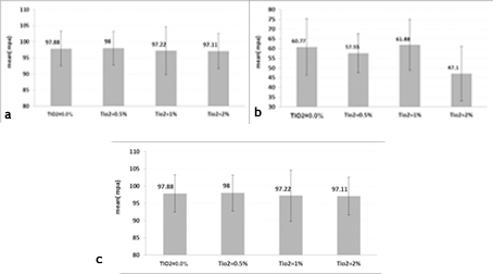 Figure 3(a) presents the mean ± SD of the compressive strength measured in all the groups. According to the results of ANOVA, there was no significant difference in the compressive strength between the three reinforced acrylic resin groups with different amounts of TiO2 and conventional acrylic resin.