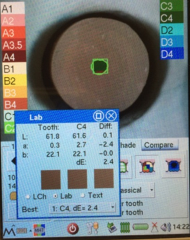 The spectrophotometer’s screen measuring the CIELab values of a specimen.