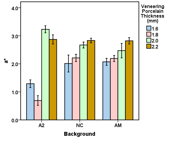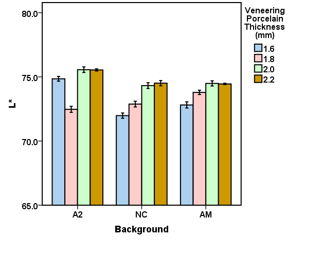 The mean CIELab and ΔE values for the veneering porcelain thicknesses of 1.6, 1.8, 2.0, and 2.2 mm for the studied backgrounds (A2, NC, AM) are presented in Figures 3 to 6. Repeated-measures ANOVA results indicated that the veneering porcelain thickness (P<0.0001), the background shade (P<0.0001) and their interaction (P<0.0001) significantly affected the CIELab and ΔE values (Table 1). Pairwise comparisons of the ΔE values using the Bonferroni correction indicated significant differences between the thickness groups for each background (P<0.05) and between the backgrounds for each thickness group (P<0.05).