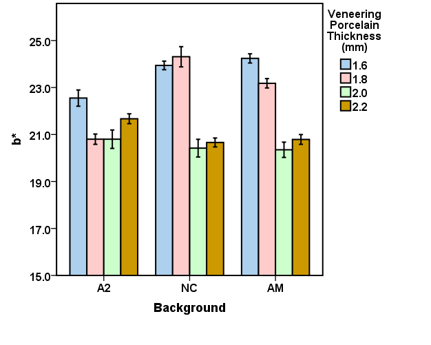 Data were analyzed with SPSS 21 (SPSS Inc., Chicago, IL, USA). Kolmogorov-Smirnov test indicated the normal distribution of data in all the studied groups (P>0.05). The effects of veneering porcelain thickness, background shade and their interaction on the CIELab and ∆E values were evaluated using repeated-measures ANOVA. Pairwise comparisons of the studied groups were performed using the Bonferroni correction. The ΔE values of the studied groups were compared with the threshold for acceptability (ΔE=3.7) with STATA (StataCorp LP, Lakeway, TX, USA) using one-sample t-test. The 0.05 level of significance was considered for all the tests.