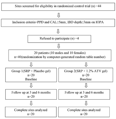 The inclusion criteria consisted of probing pocket depth (PPD) and clinical attachment level (CAL)≥5 mm, along with the presence of at least one pair of similar intraosseous defect in a systemically healthy patient, which was ≥3 mm deep as identified on a diagnostic intraoral periapical radiograph (IOPA). Patients with suspected or known allergy to the ATV/statin group, those on systemic ATV/statin therapy, with a history of periodontal treatment in previous 6 months, aggressive periodontitis patients, tobacco chewers, smokers, alcoholics, diabetic patients and pregnant or lactating women were excluded from the study.