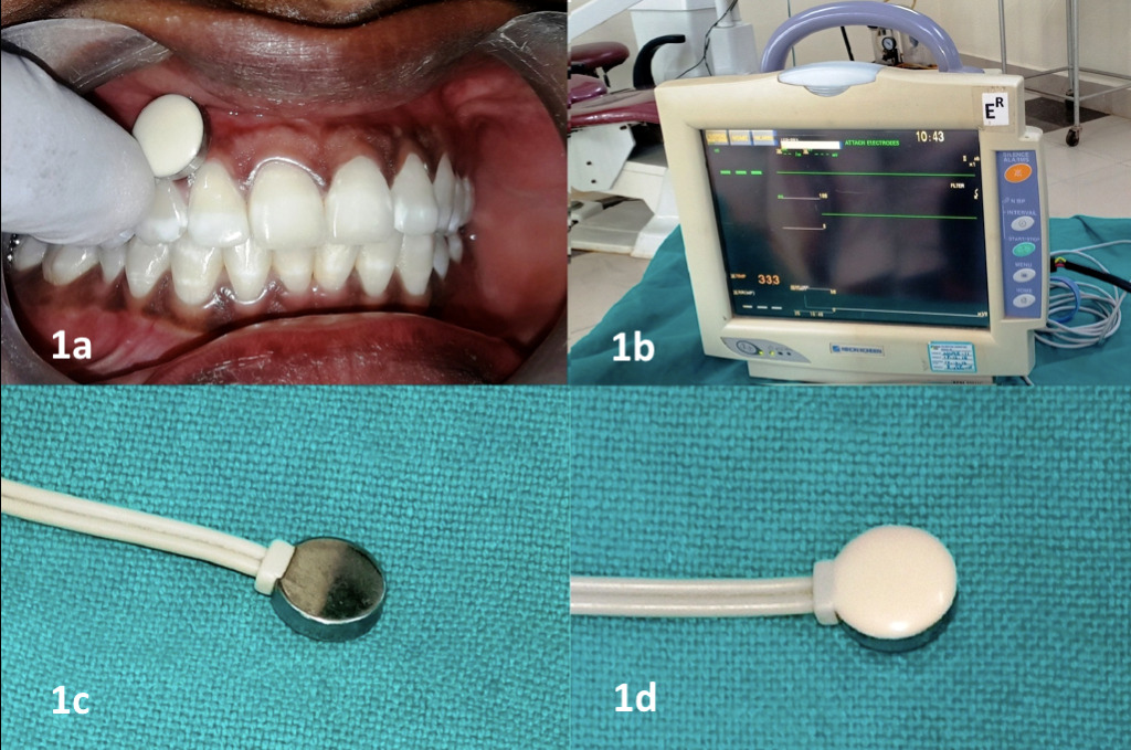 Measuring gingival surface temperature. 1a: Placement of the lead over the gingival surface. 1b: Monitor displaying the temperature. 1c, 1d: The lead used to measure the temperature.