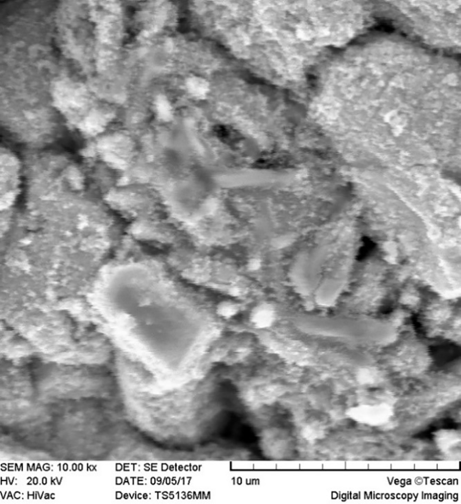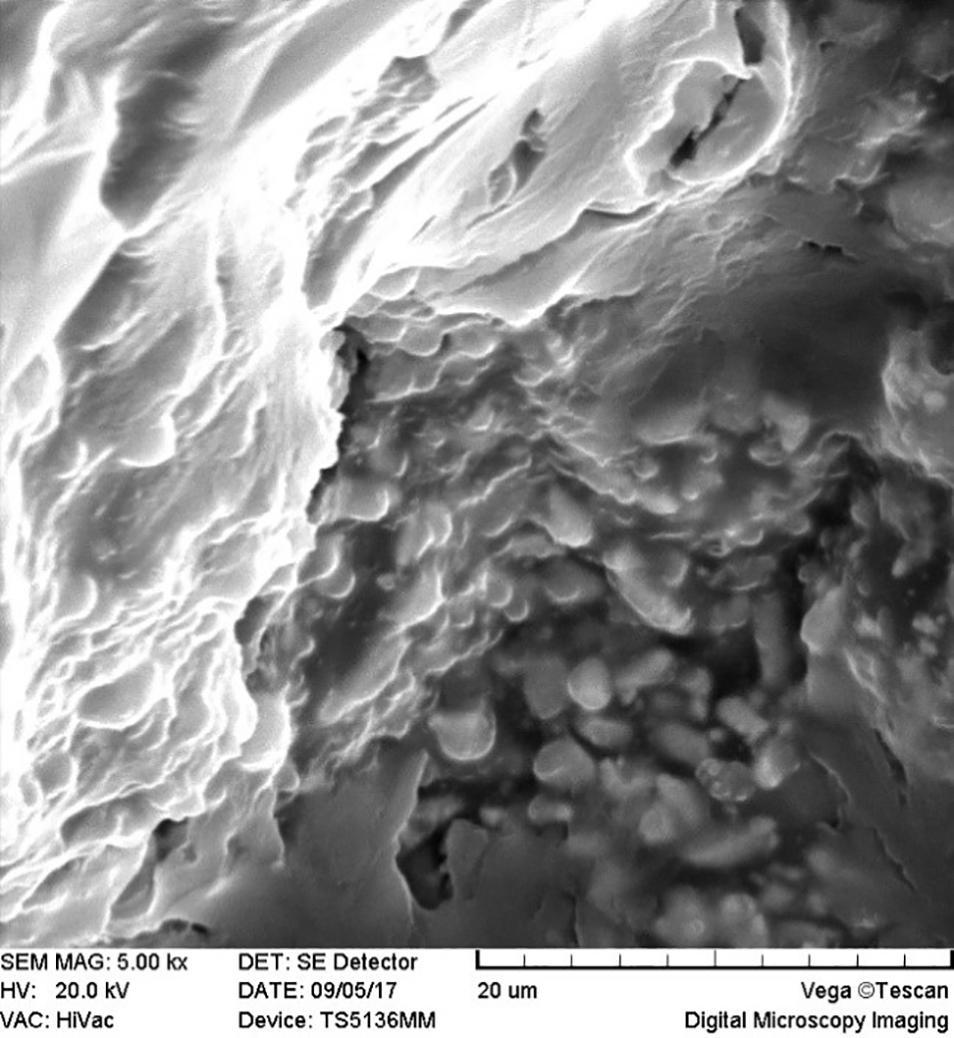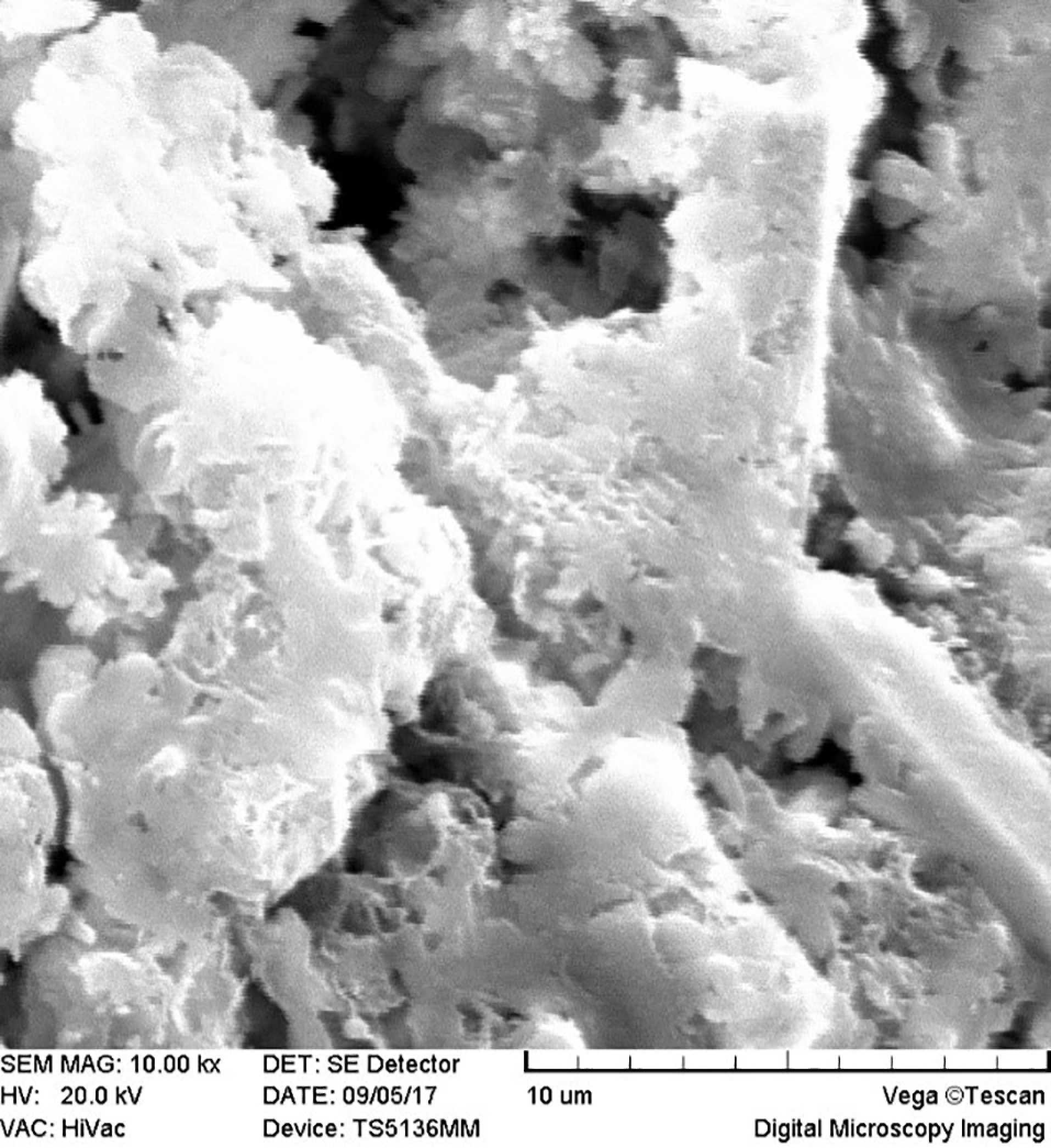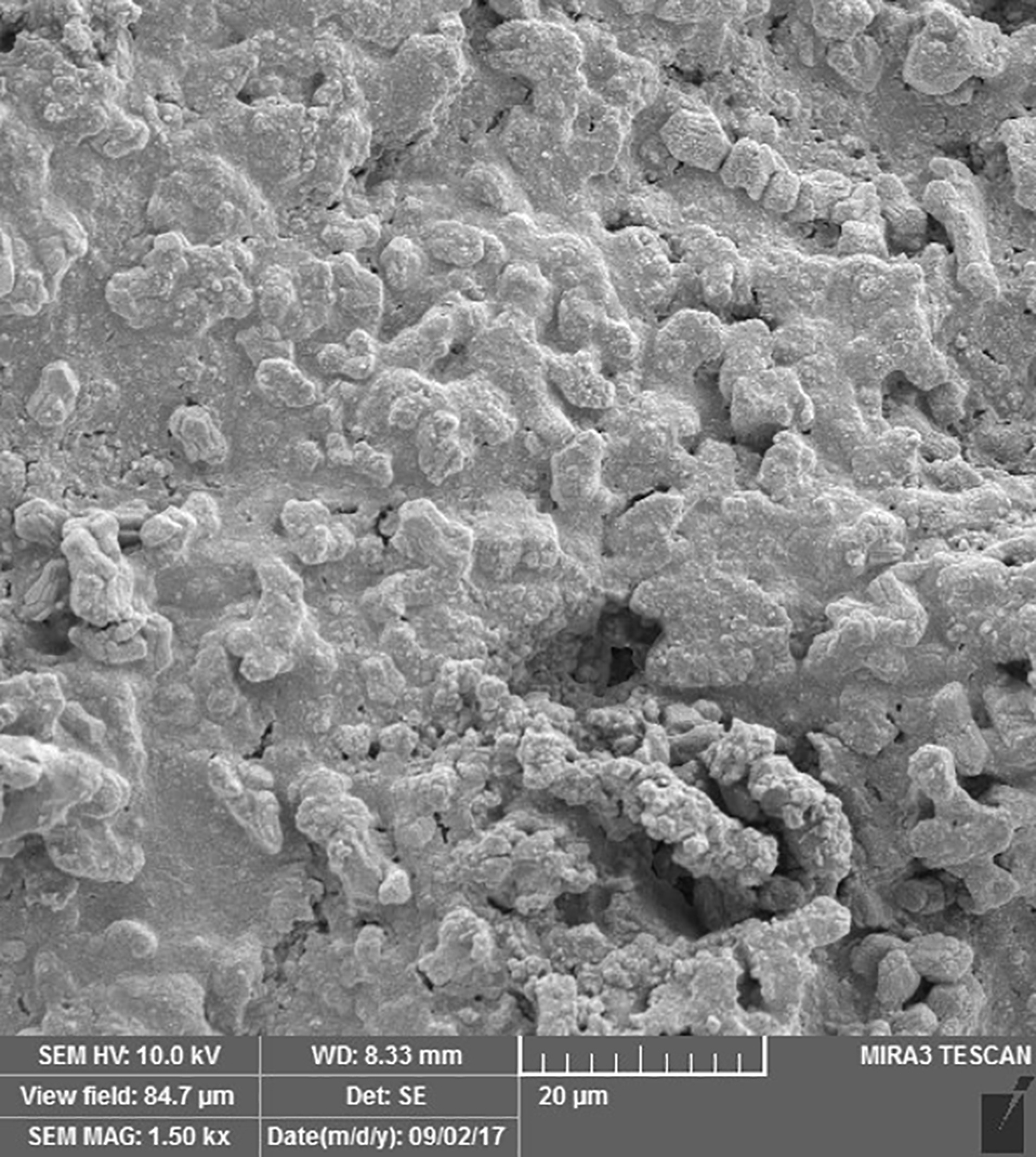 SEM images revealed cellular adhesion in CEM cement-containing samples in both the set and unset conditions (Figures 1 and 2). In samples containing AH26, no cellular adhesion was detected in the unset samples (Figures 3 and 4); however, in the set samples, cellular adhesion was shown, which was similar to the MTA Fillapex-containing samples (Figures 5 and 6). Concerning MTA Angelus and ProRoot MTA, cellular adhesion was observed in samples that were placed in contact with the stem cell-containing solution before setting; however, no adhesion was observed in any of the samples after setting (Figures 7-10). Concerning simvastatin, no cellular adhesion was observed in any sample before setting. Also, this material had dissolved in the solution and washed away from the retrograde cavity in the evaluation carried out after setting.