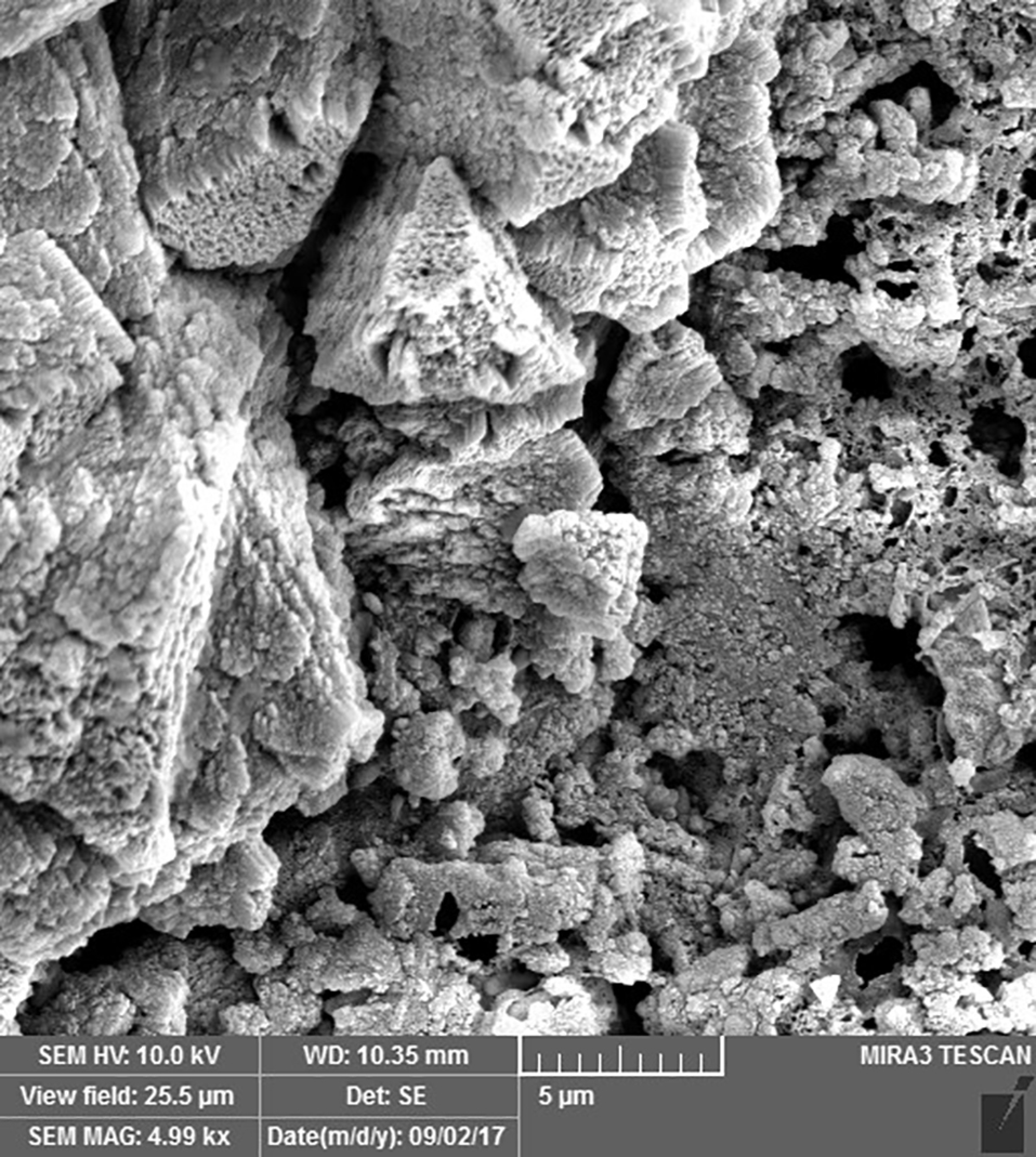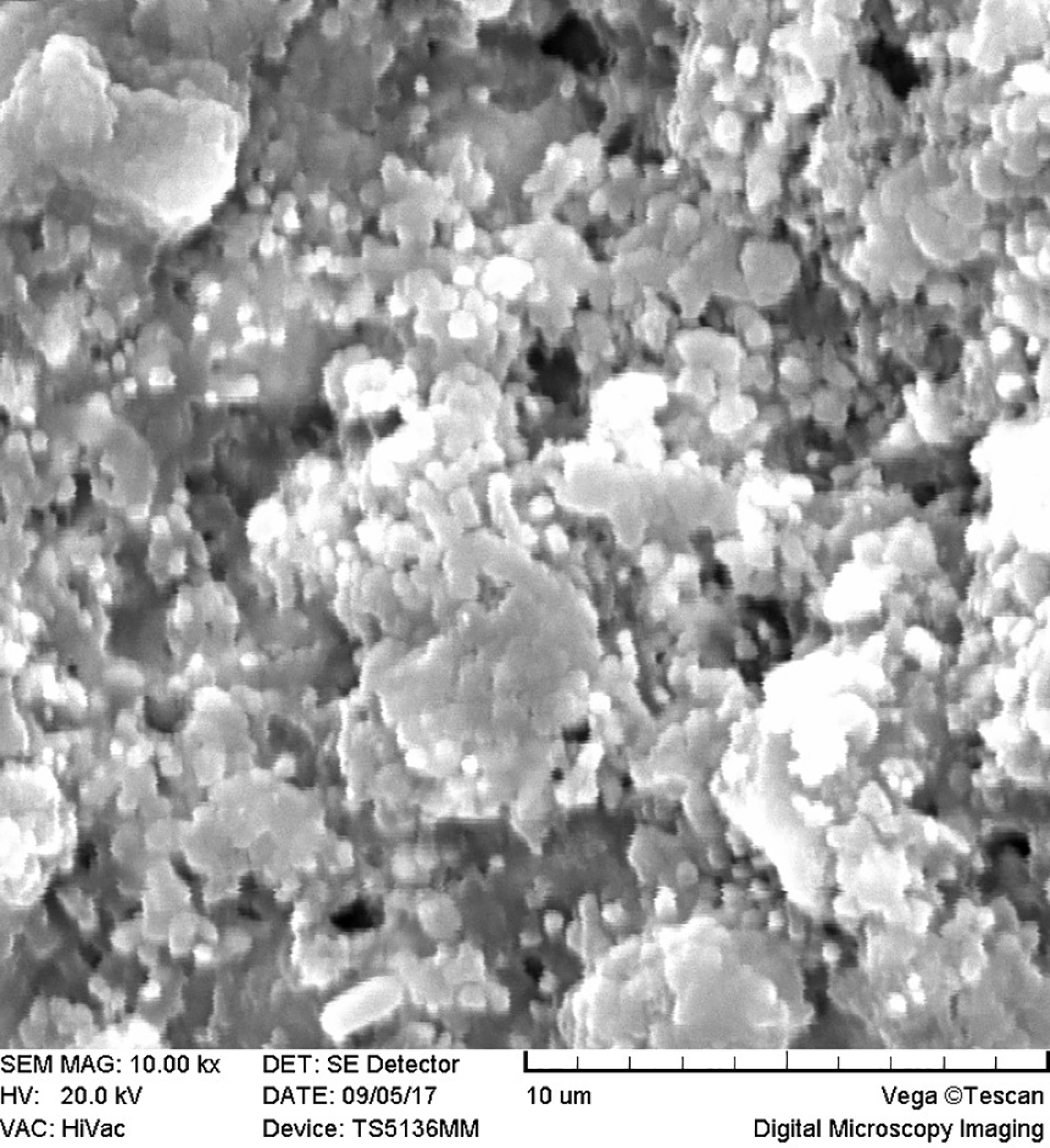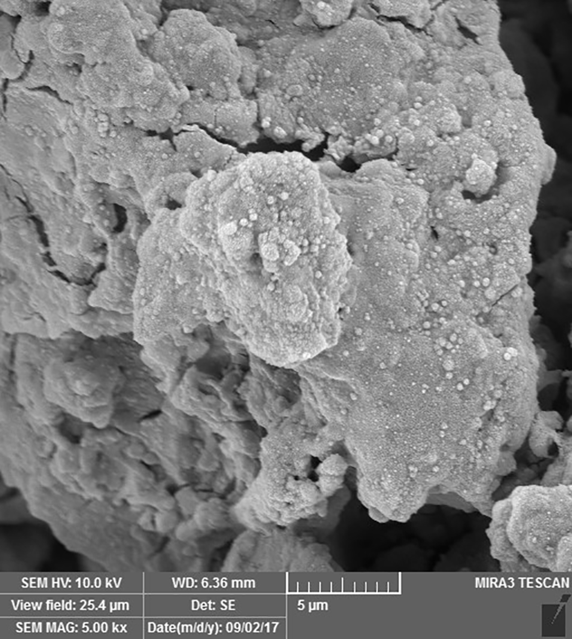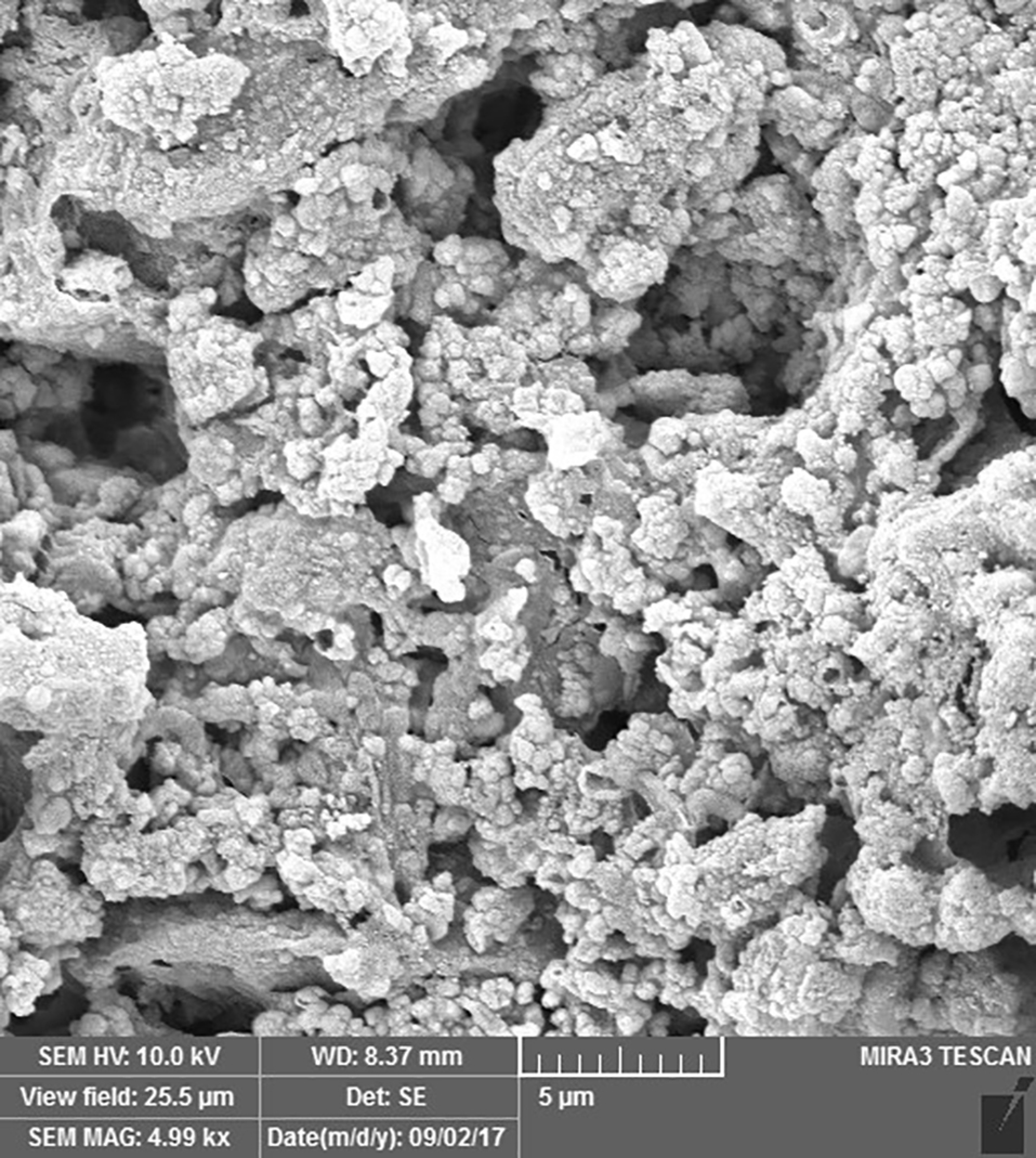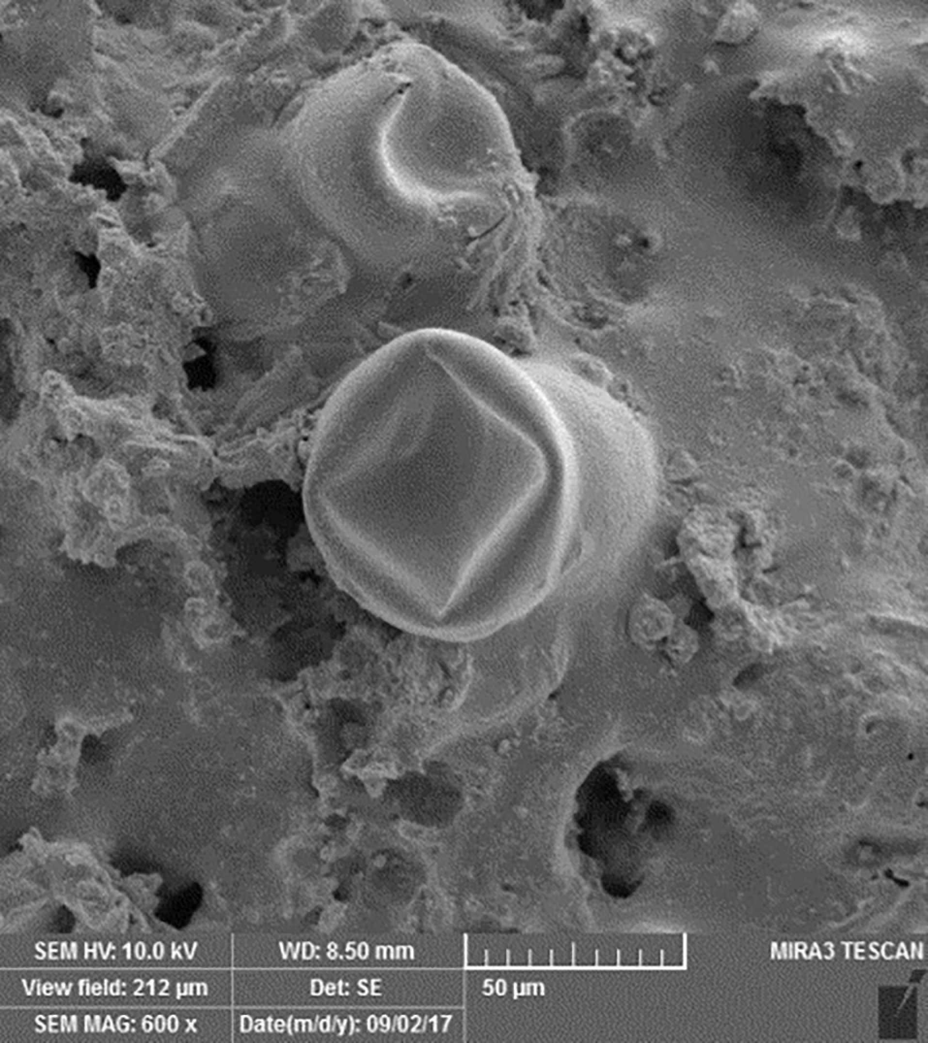SEM images revealed cellular adhesion in CEM cement-containing samples in both the set and unset conditions (Figures 1 and 2). In samples containing AH26, no cellular adhesion was detected in the unset samples (Figures 3 and 4); however, in the set samples, cellular adhesion was shown, which was similar to the MTA Fillapex-containing samples (Figures 5 and 6). Concerning MTA Angelus and ProRoot MTA, cellular adhesion was observed in samples that were placed in contact with the stem cell-containing solution before setting; however, no adhesion was observed in any of the samples after setting (Figures 7-10). Concerning simvastatin, no cellular adhesion was observed in any sample before setting. Also, this material had dissolved in the solution and washed away from the retrograde cavity in the evaluation carried out after setting.
