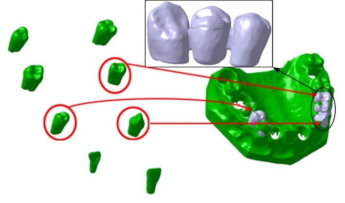Volume model of teeth #13, #14 and #15 and their assembly on gingival cavities and modified bridge model.