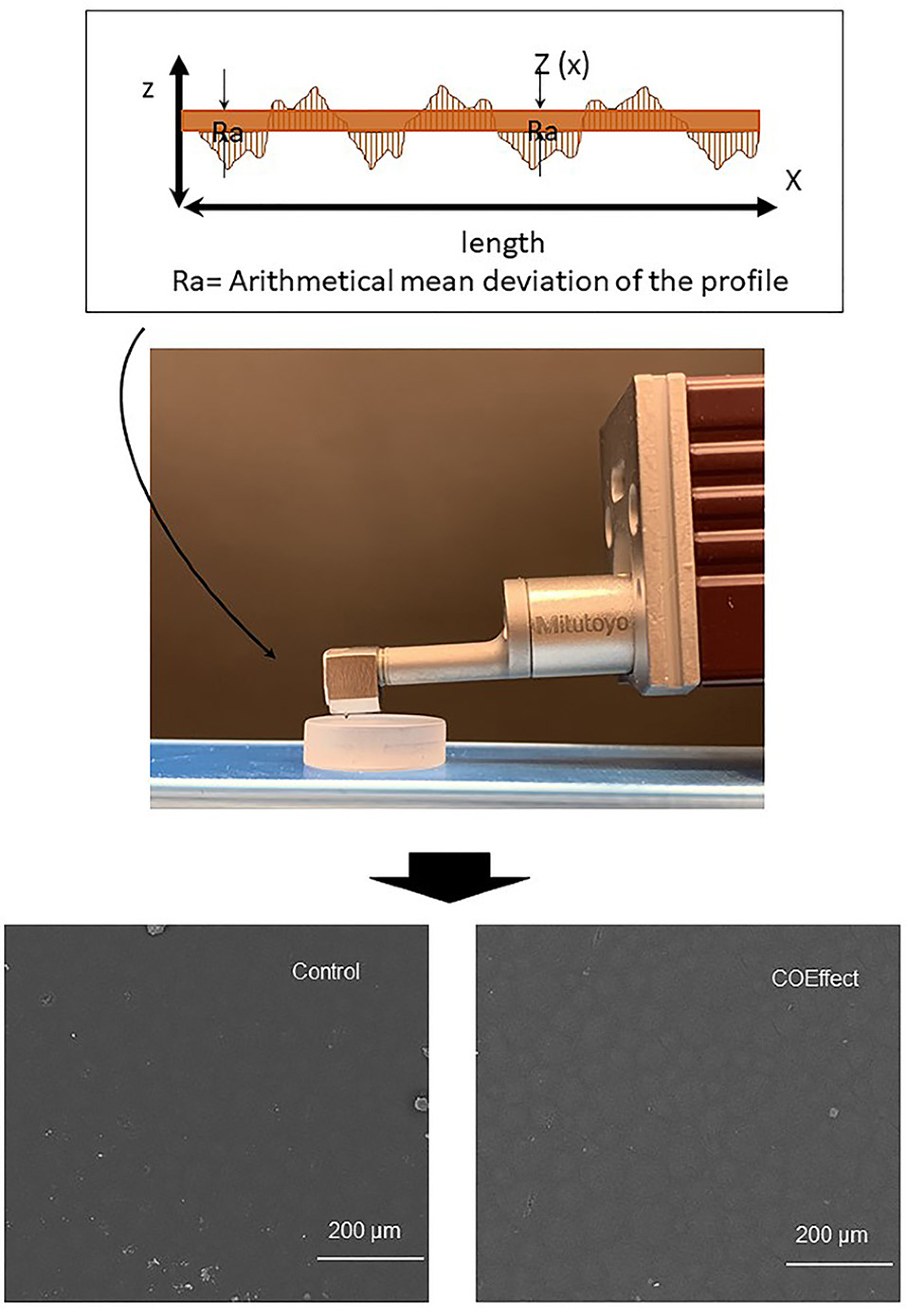 Schematic representation of roughness assessment of orthodontic acrylic resins. Illustrative scanning electron microscopy images of control (water) and one of the disinfecting solutions (Coeffect) performed to exemplify the lack of changes in the surface morphology after treatment.