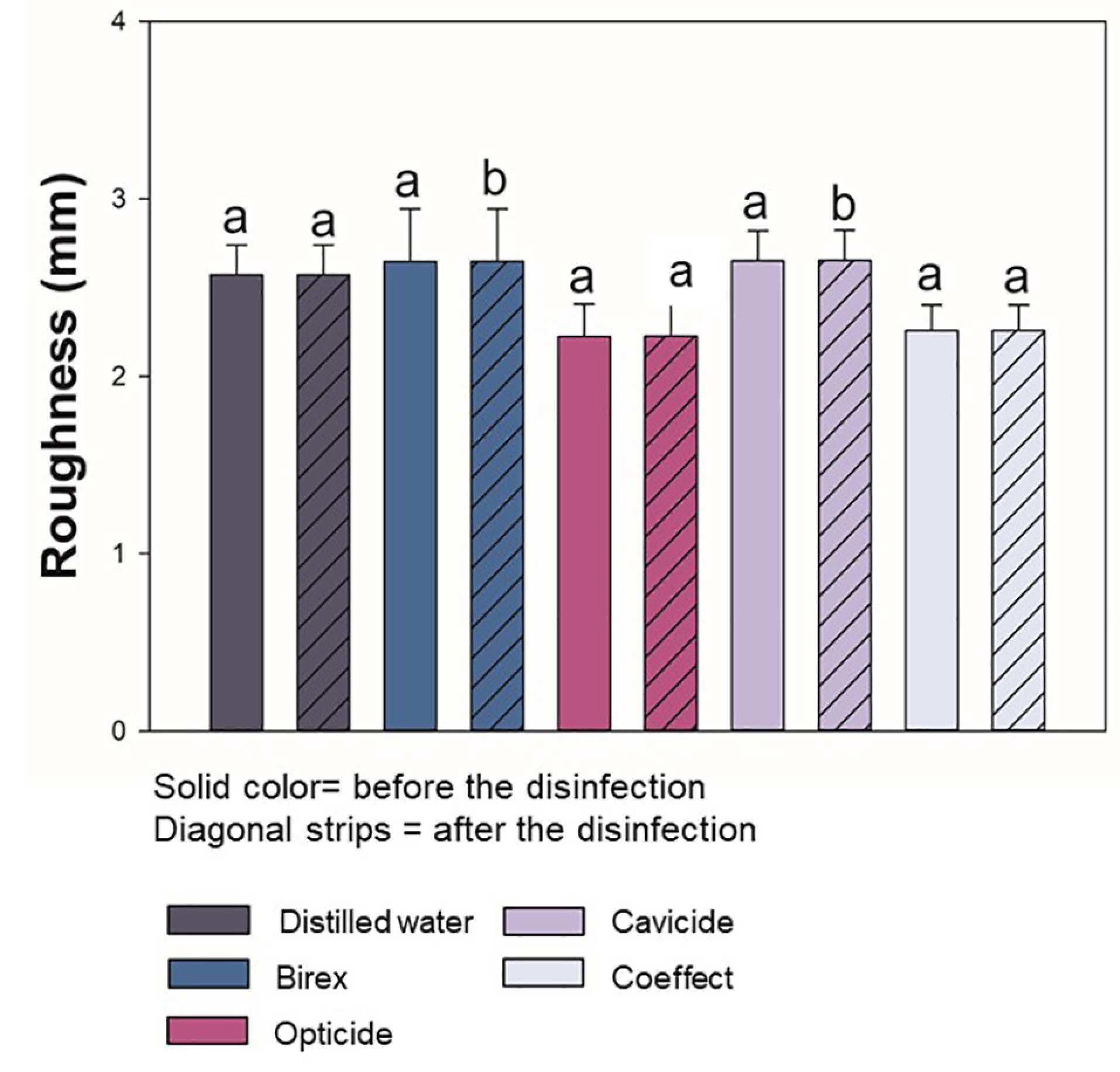 Results. Some of the disinfectants (BirexSE and CaviCide) resulted in significant changes in surface roughness values before and after the disinfection compared to the controls (P<0.05). The groups that were in contact with distilled water, Opti-Cide, and Coeffect did not exhibit significant differences insurface roughness before and after the intervention (P>0.05). However, from a clinical perspective, the resulting variations in surface roughness (<%0.15) induced by these solutions might not reflect clinically significant differences.