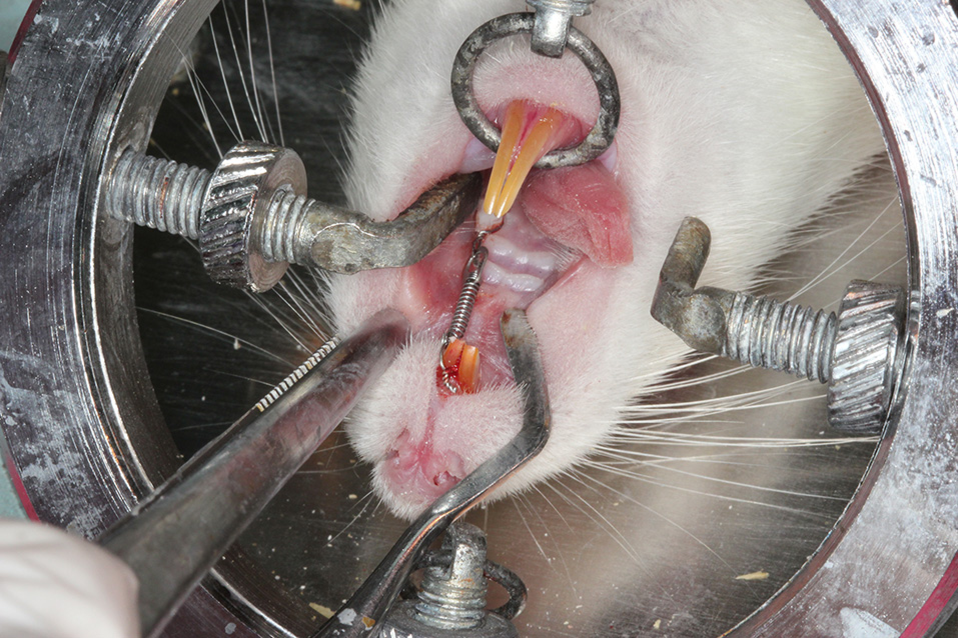 Experimental tooth movement was induced using a modification of the method described by Hashimoto et al9 with a closed-coil spring (6 mm) (American Orthodontics, Sheboygan, USA) with eyelet-like attachments ligated to the maxillary first molar by a stainless-steel ligature wire (G&H Wire Company, USA). The other side of the coil spring was also ligated, with grooves in the maxillary incisors drilled just above the gingival papilla using the same ligature wire (Figure 2). The ligature wire around the incisor was attached with light-cured composite resin (Ormco LCBC; Glendora, CA, USA). A closed coil spring with a force of 50 g was applied to the upper first molar to move it mesially.10,11