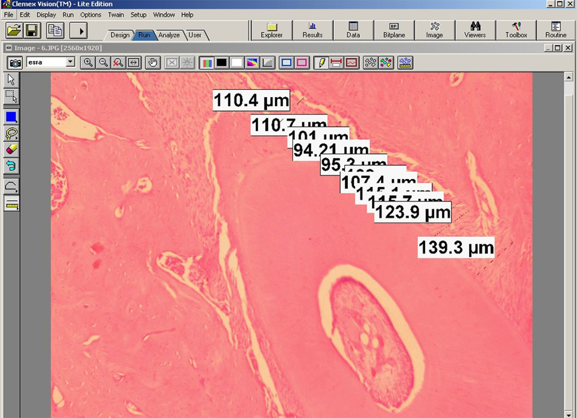The periodontal gap (the distance between the outer border of the tooth root and the alveolar bone) on the mesial and distal roots of the first molar was measured at 10 different points, and the mean values were recorded for the mesial and distal surfaces. These measurements were repeated for each visible root of the first molar on the experiment side (upper left), and the means were calculated for each tooth (Figure 3). 14055878 µm² areas were designated with the same image analysis system at the mesial and distal halves of the roots. Thereafter, collagen fibers, osteoblasts, and osteoclasts were marked using the same program in the 14055878 µm² areas (Figures 4). Damaged cells were not evaluated. The marked cells were automatically counted with the image analysis system. All the histomorphometric measurements were performed using the Clemex Vision Lite 3.5 Image Analysis Program.