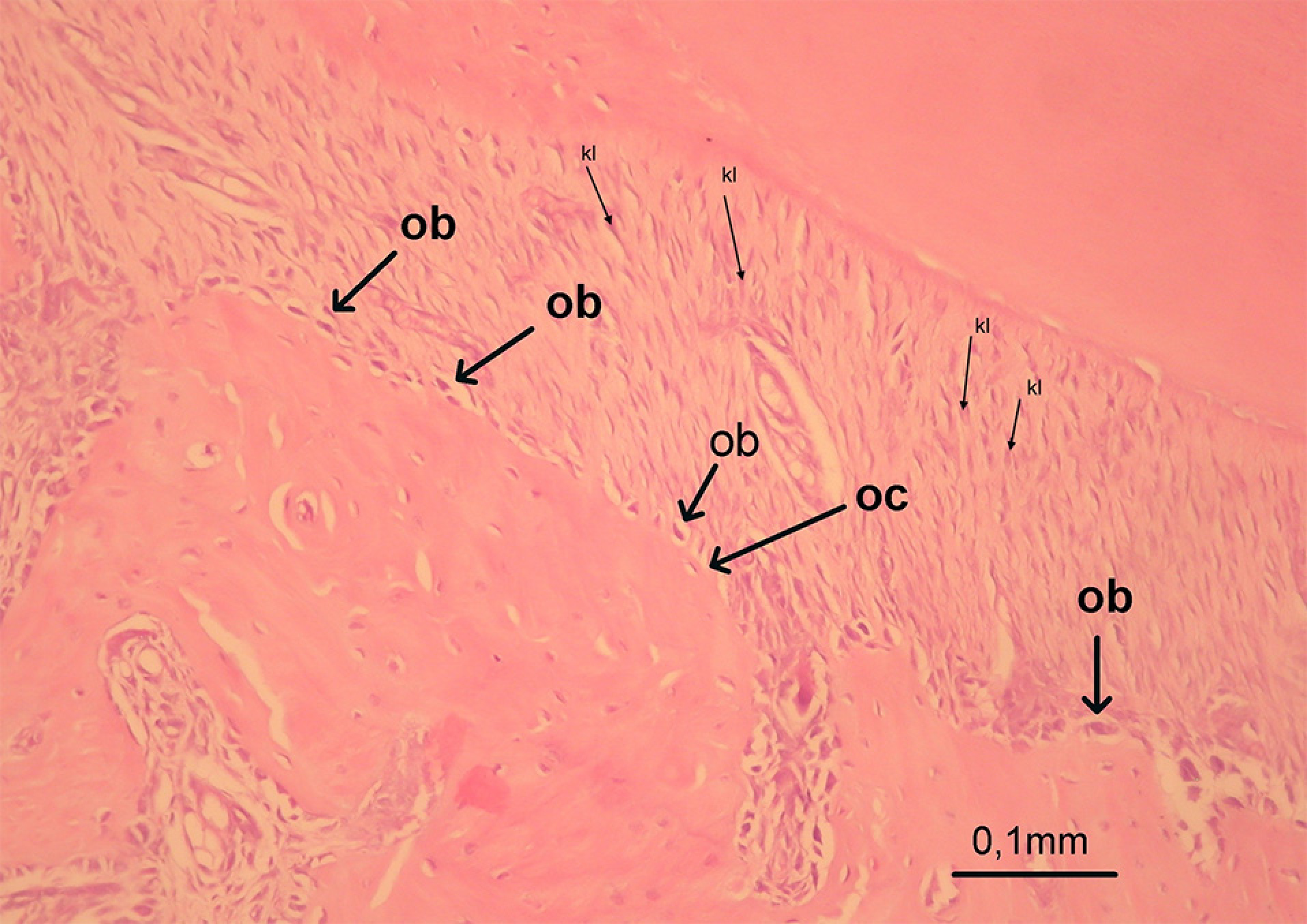 Measurement of periodontal gap on mesial and distal roots of the first molarat 10 different points (Group II) (H-E, 40X)