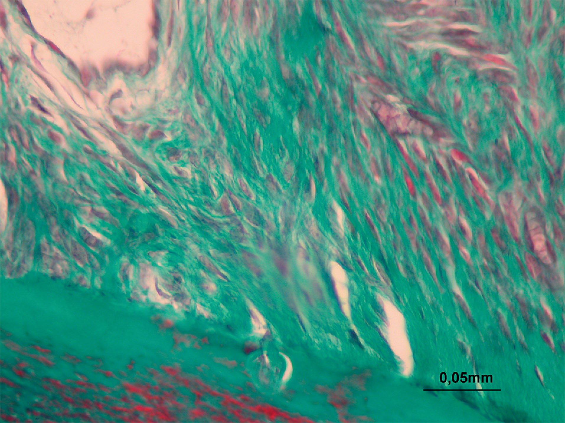The tissue samples were fixed in 10% neutral-buffered formalin solution. After 48 h of fixation, the specimens were placed in 10% EDTA for decalcification.10 After decalcification, the tissue samples were examined by routine light microscopic techniques. The paraffin-embedded blocks were cut to 4‒5-µm-thick sections, which were stained with hematoxylin–eosin (HE) and Masson’s trichrome. The stained sections were then examined under a light microscope (Nikon Eclipse E400). All the histopathological evaluations were performed in a double-blinded plan.