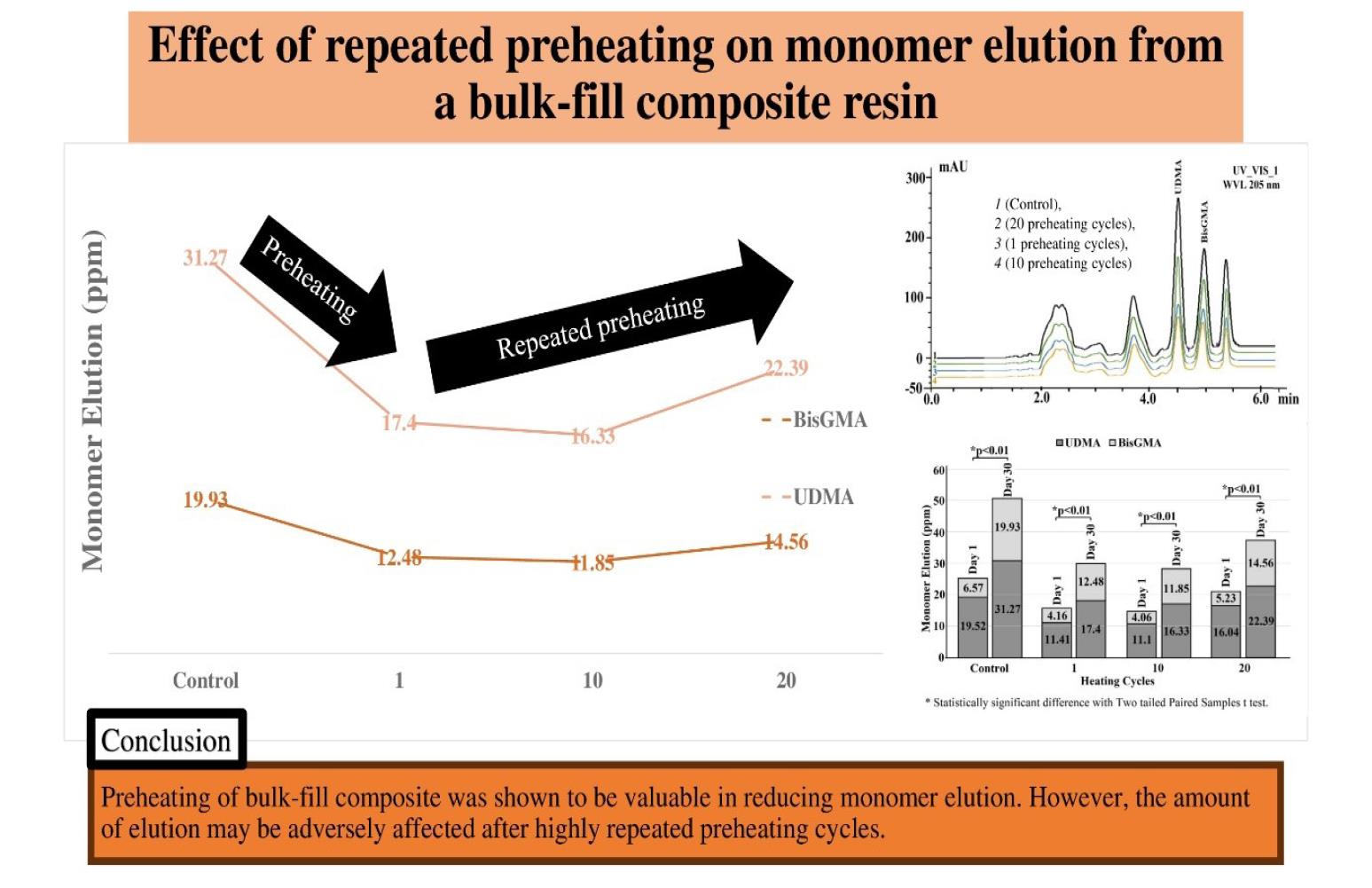 Preheating of the bulk-fill composite resin was shown to be effective in reducing monomer elution. However, monomer elution was adversely affected after repeated preheating cycles of 20.